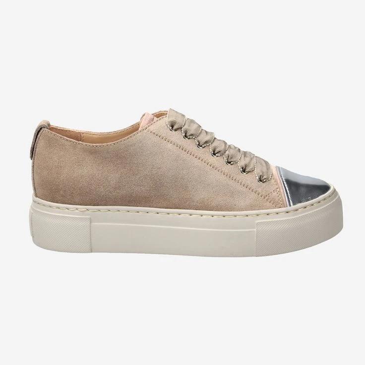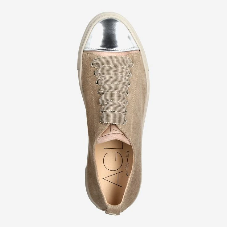 This luxury sneaker of the Italian designer trio AGL brings a breath of fresh air to your look! The model MOLLIE is designed particularly lively by the toe cap of metallized leather. A soft contrast is created over the beige suede. The ribbed lacing adds another highlight to the feel. Brand-typical logo details on the tongue and heel round off the designer sneaker with a love of detail.