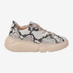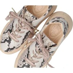 - Exchangeable footbed, suitable for insoles, logo application, logo embossing, platform heel, double effect laces with matt gold-colored MiKron rivets, upper made of embossed smooth leather in trendy animal look (snakeskin look)