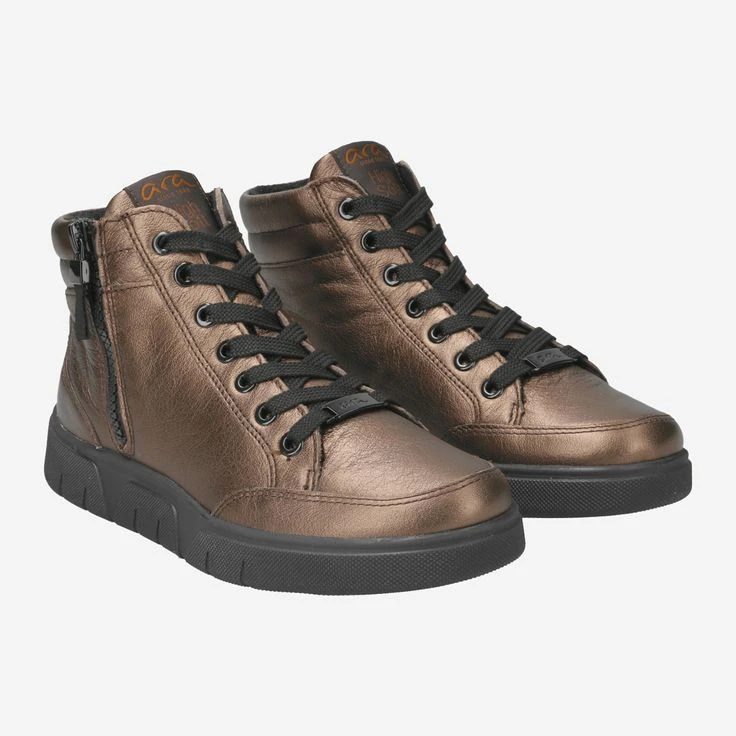 Sporty hightop sneaker? Or rocking bootie? But somehow you would also like glamour? Well then look forward to ROM, the bronze-brown coated leather sneaker from ara! The matte metallic effect looks classy and futuristic. With it, you give jeans looks a rocky touch, complement knitwear outfits nobly and set an exciting contrast to feminine dresses. In a set of cards this would be: The Joker!