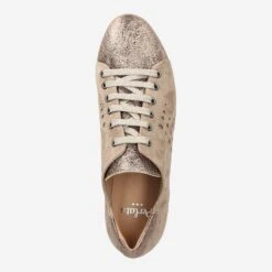 This feminine sneaker from Perlato is characterized by the narrow shape. But also the material mix of a suede and elements of metallized leather convinces visually. With this women’s shoe they are sporty-elegant on the road.