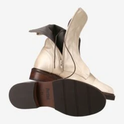 Sophistication and extravagance characterize the look of this noble lace-up ankle boot. Finest metallized leather meets a toe cap of beige patent leather. The lacing runs along the inside of the lacing strip, and picks up the contrast with the dark sole. Precisely handcrafted by Spanish manufacturer Pertini, this is the cream of the new collection. Combine it with a dress, jeans or even festive!