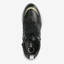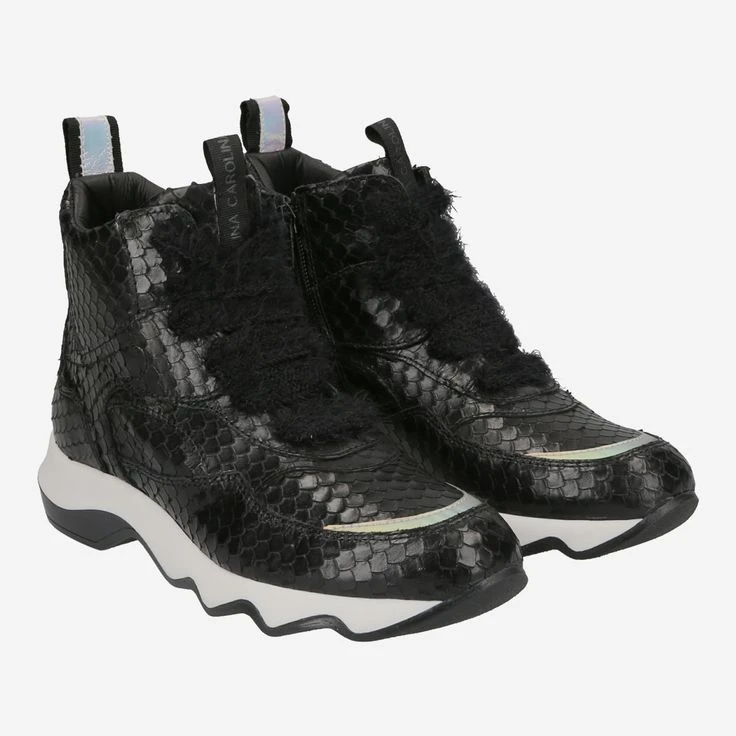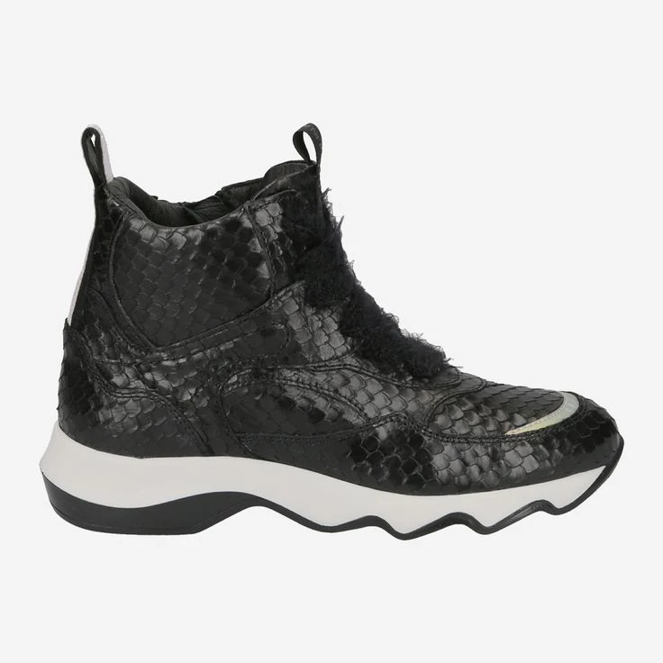 Look forward to this exciting boot from Donna Carolina! Numerous details transform this shoe into a cool statement boot. The black leather is hand embossed in reptile look and interprets the animal look unique and sporty design. The light-colored sole has become cult, and here its wave shape gives it an additional creative design. Two decorative and practical entry loops round off the extravagant look with the unusual laces. There is much to discover here!