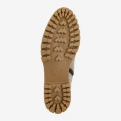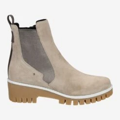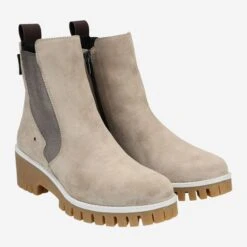 This beige-gray ankle boot from Donna Carolina is your new casual fashion statement! The velvety suede is separated from the yellow platform sole by a white contrast strip. The practical zipper is complemented by a wide stretch insert that has a noble metallic shimmer. The heel area is set off by a dark brown logo application.