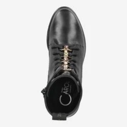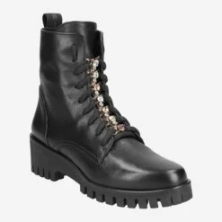 Noble and rocky at the same time is this black ankle boot from Donna Carolina! Inspired by the military boot, the Italian luxury manufacturer interprets this model with a narrower toe and sparkling jewelry applications along the lacing. The colorful glass crystals look particularly noble and exclusive through the contrast of the black smooth leather, and give your look a good dose of glamour!