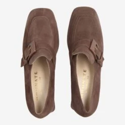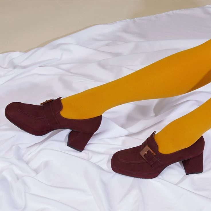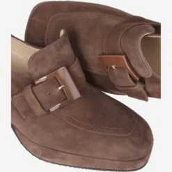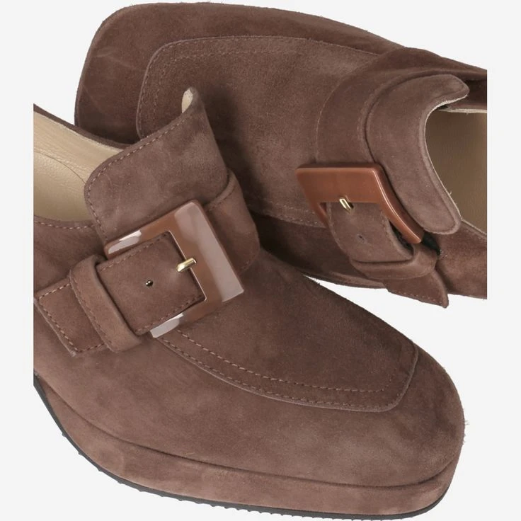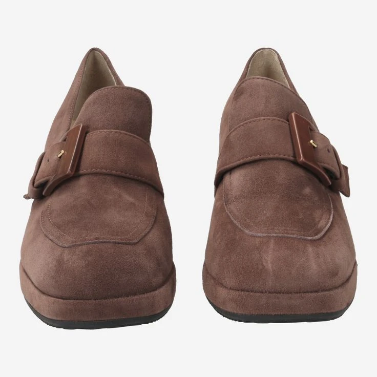 - Metal closure, block heel, loafer application, stretch inserts, decorative seams