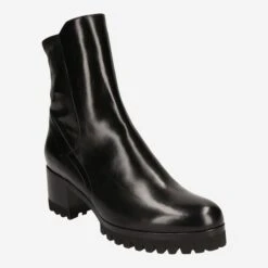 In the style of classic Chelsea boots present these exclusive ankle boots from Trumans, which are made of soft black smooth leather. While the cover sole is made entirely of leather, the lining is half made of textile. A practical zipper ensures easy entry, furthermore, the stretch insert in the approximately 19 cm high and regular 24 cm wide shaft ensures an optimal fit. The rubber-leather sole with its 45 mm high block heel also promises maximum stability.
