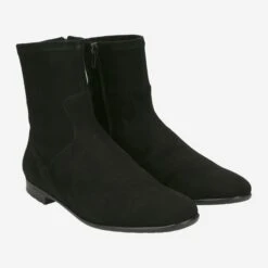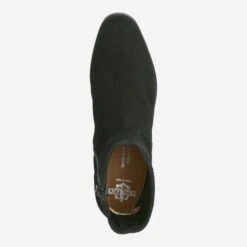 Soft black suede leather characterizes the simple yet elegant design of these ankle boots by Truman’s. Made in the style of typical stretch boots, the shoes are fully lined with soft leather and textile on the inside and offer their wearer the best comfort thanks to a flexible rubber sole with an approximately 20 mm high heel. In the approximately 17 cm high shaft provides a stretch insert for an optimal fit