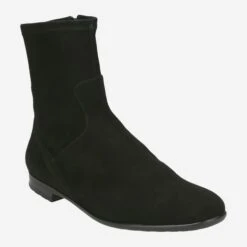 Soft black suede leather characterizes the simple yet elegant design of these ankle boots by Truman’s. Made in the style of typical stretch boots, the shoes are fully lined with soft leather and textile on the inside and offer their wearer the best comfort thanks to a flexible rubber sole with an approximately 20 mm high heel. In the approximately 17 cm high shaft provides a stretch insert for an optimal fit