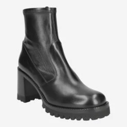 - Zipper closure, block heel, adaptable sock boot style upper, wavy placket, breathable.