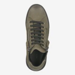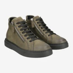 This green high sneaker from NoClaim scores with its casual look. The nubuck leather is kept in authentic vintage character, and harmonizes ideally with the black sole. A side zipper serves for easy entry. Logo embossing, decorative perforations and a leather application on the zipper round off the casual street style.