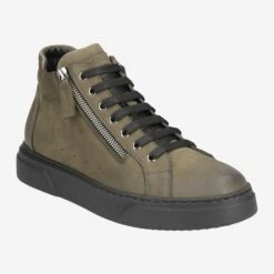 This green high sneaker from NoClaim scores with its casual look. The nubuck leather is kept in authentic vintage character, and harmonizes ideally with the black sole. A side zipper serves for easy entry. Logo embossing, decorative perforations and a leather application on the zipper round off the casual street style.