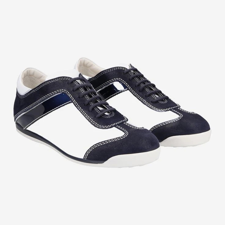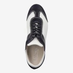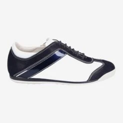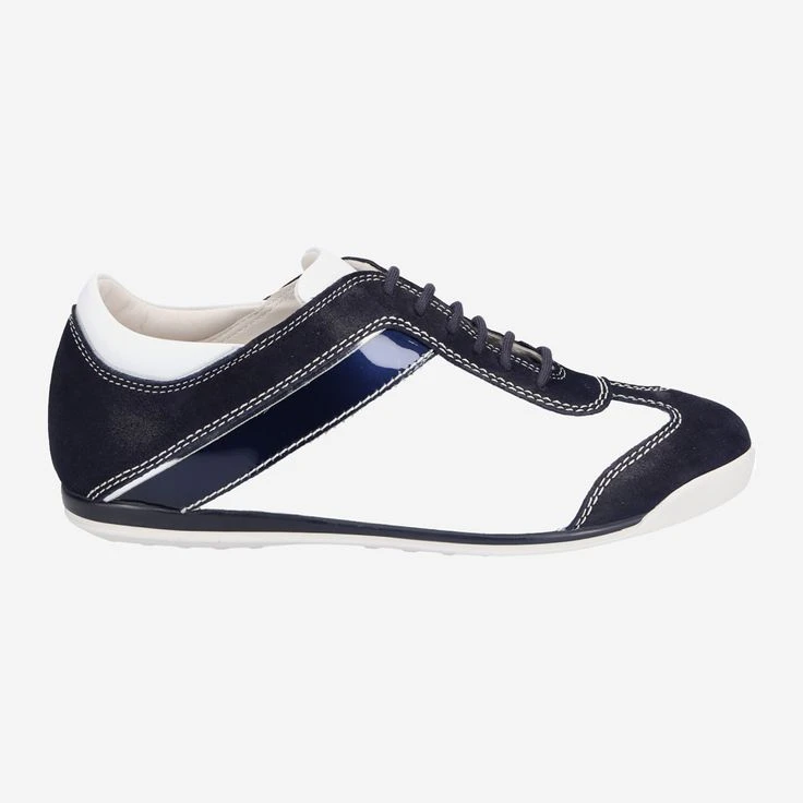 Experience futuristic design – combined with sporty casualness! This exclusive lace-up shoe made of white smooth leather is refined by dark blue leather details. Bright contrast stitching accentuates the design and establishes a playful touch. The lining made of supple leather gives you pleasant comfort and breathability. Your individual insoles are easy to insert, which the cover sole is interchangeable. With this you wear an exciting look!