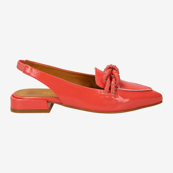 Extravagant, rocking, feminine, extraordinary: if you like to play with these attributes, Maripé has just the right model for you: SILVIA. This new sling pump captivates with coral red patent leather, feminine design and noble details. The loafer typical application in loop form is refined by numerous, silver-colored micro rivets. The narrow heel strap offers you a comfortable hold thanks to a stretch area. And by the way, your chocolate side is skillfully put in the limelight! Use them wherever you want to playfully convince with style and expression!