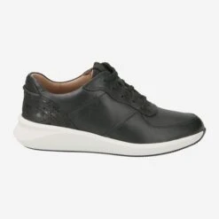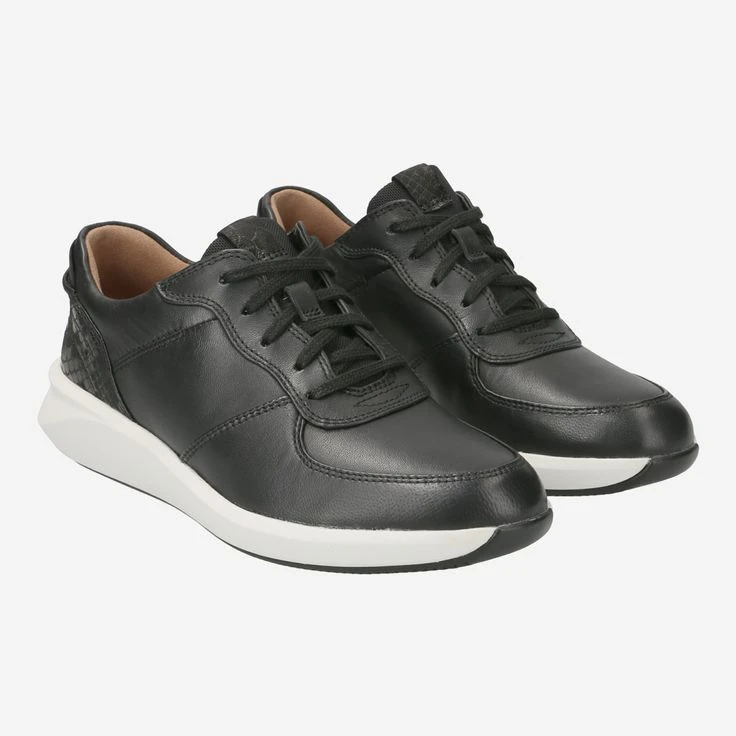 The exciting lace-up shoe “Un rio” from Clarks promises you high comfort, as well as a stylish design! The black smooth leather is innovatively set in scene by the heel area of embossed imitation leather. The embossing in animal look gives the model an extra dose of glamor! This exclusive lace-up shoe is rounded off by a white rubber sole – the current must-have of the sneaker scene!