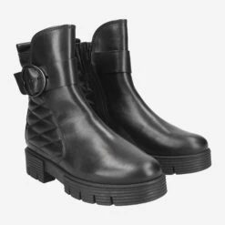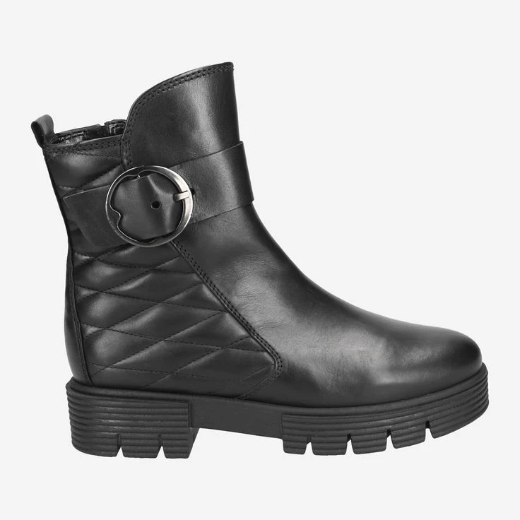 This cool black ankle boot will accompany you just as well to a concert of your favorite band as on a girly afternoon in the city! The expressive ring-shaped metal closure separates the smooth leather look of the front from the padded square pattern along the side. This mix gives the shoe a dynamic all its own, so take some of that oomph into your fashion portfolio!