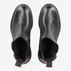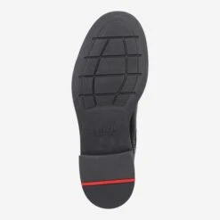 - Block heel, entry loop, decorative stitching, stretch inserts, logo embossing, contrast stitching