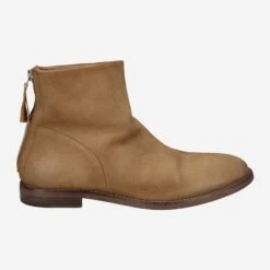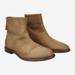 Individuality. Authenticity. Handmade. This is what distinguishes this ankle boot from the MOMA manufactory. The model “Marrone” is made of brown suede, which has been refined in a vintage look. The authentic character of this particular shoe is further complemented by a zipper on the heel. The leather application on it perfectly matches the overall look of the shoe. The stitched-through sole is partly made of leather, rubber areas give you support. This shoe has a special character, look forward to it!
