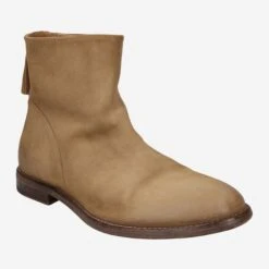 Individuality. Authenticity. Handmade. This is what distinguishes this ankle boot from the MOMA manufactory. The model “Marrone” is made of brown suede, which has been refined in a vintage look. The authentic character of this particular shoe is further complemented by a zipper on the heel. The leather application on it perfectly matches the overall look of the shoe. The stitched-through sole is partly made of leather, rubber areas give you support. This shoe has a special character, look forward to it!