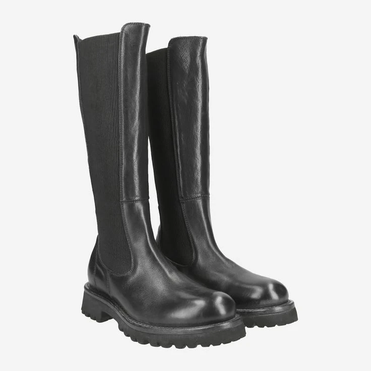 Creative, individual and expressive. The charismatic spirit of the Italian luxury manufacturer MOMA combines a unique free spirit with traditional craftsmanship. A combination that creates true works of art! Discover this new black leather boot, with a design inspired by the popular Chelsea boot. The medium-high shaft visually stretches the leg, and fits individually and flexibly thanks to the ribbed stretch inserts. The leather is given a subtle patina by the special dyeing technique, which picks up aspects of the vintage look. An absolute cream piece!