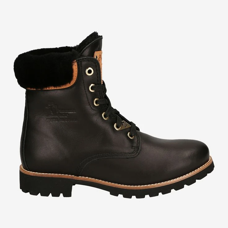 Also for the fall / winter Panama Jack has come up with something. This cool ladies boot of the trendy brand appears in a simple black tone. The model scores not only with a soft and high-quality surface of the finest smooth leather, but also by its robust and flexible sole. The gold-colored eyelets bring a nice visual change to the many black and are accompanied by a metal application of the same color with logo embossing. The cuddly, fluffy warm lining, standing from 100% lambskin, guarantees the best wearing comfort and keeps your feet warm even in the coldest weather.