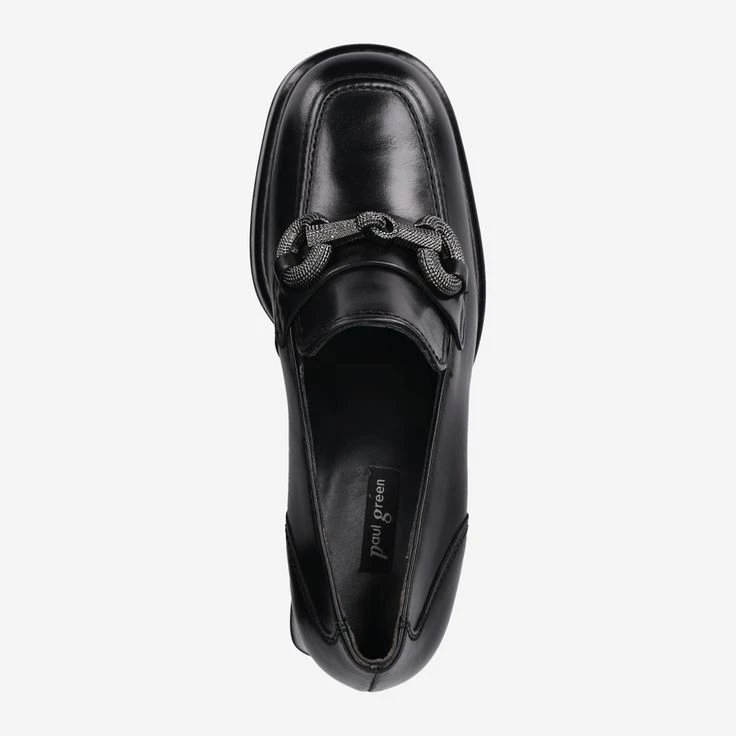 For trendy look provide these high front pumps from Paul Green. The charming model made of black smooth leather provides with the attractive jewelry chain at the instep area for hip style. The striking block heel convinces with a dreamlike appearance. A chic pair that perfectly complements your fashionable wardrobe! Paul Green makes shoes with great passion and mastery, which is expressed in perfection, quality, style and fit. The result: a unique, uplifting wearing experience! The Paul Green effect.