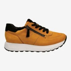This sneaker from Paul Green is a trendy everyday shoe for the active and modern woman. He can be wonderfully combined with many outfits. The curry-colored nubuck leather is a must-have of the season and the side zipper is a practical decorative element, as lacing is no longer necessary. And as usual, this women’s sneaker comes in the well-known Paul Green quality.