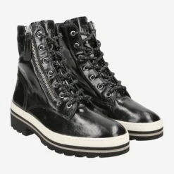 A real eye-catcher of the current collection of Paul Green is this casual winter boot! It combines a wide variety of style elements with each other, creating a young, dynamic look. The black, coated leather is often used in the business sector, the tread sole is classically known from boots, and the design skillfully picks up the high sneaker. The exciting look is complemented by a high-quality lining made of 100% wool (merino wool), which was obtained mulesing-free. The thermal insole provides optimal protection from the cold. A bright rubber strip protects against splashing wetness. Simply optimal!