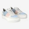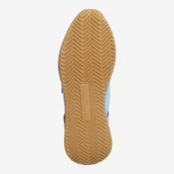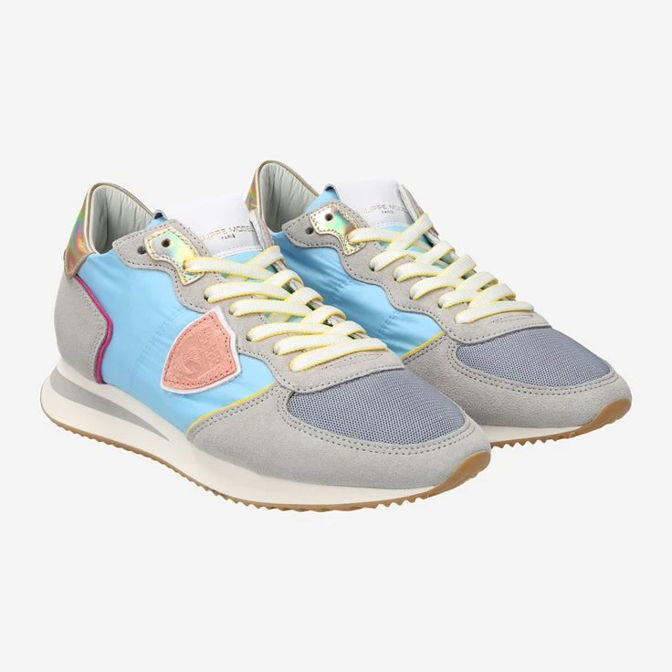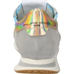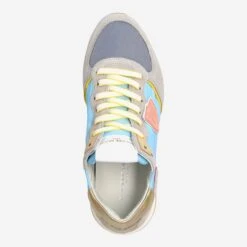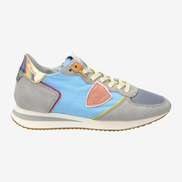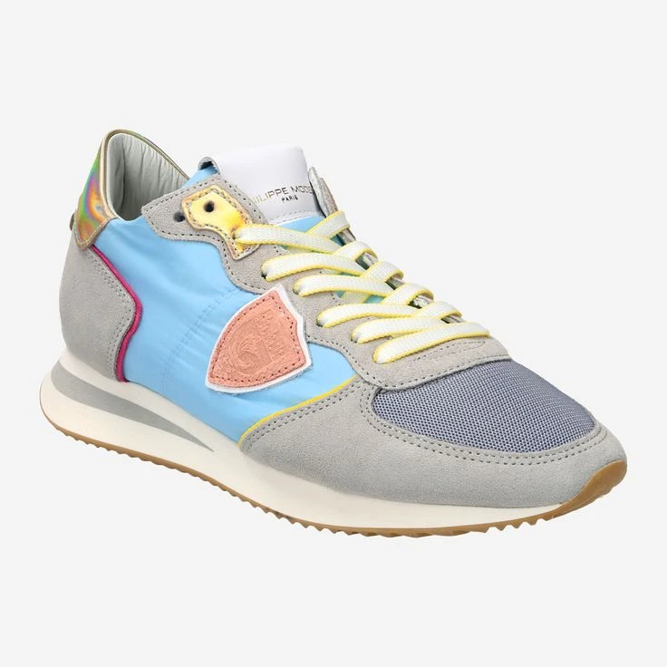 Philippe Model has already conquered the catwalks of Paris, now it’s the turn of all fashionistas! This model inspires with the mix of gray suede, blue nylon and mesh material. A gold shimmering heel cap with logo print refines the sporty look extravagantly. Characteristic for the designer is the logo application, the coat of arms of Paris, which draws the eye here in salmon-colored suede.