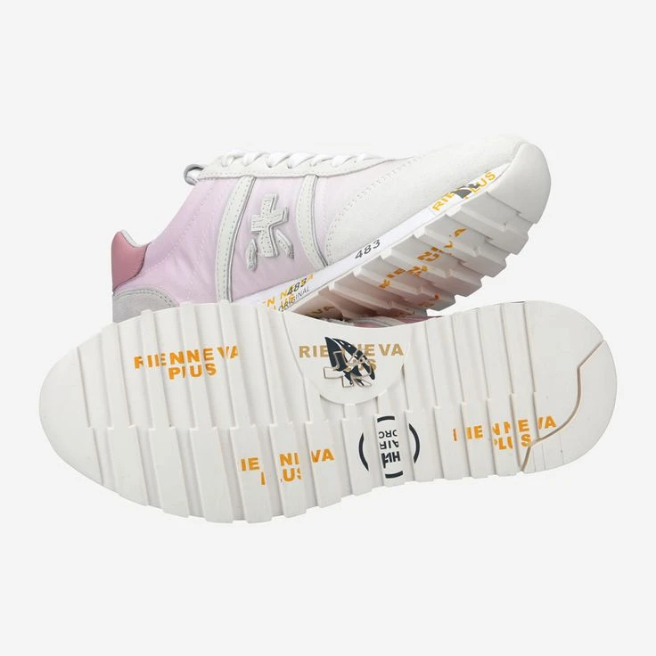 - Exchangeable footbed, suitable for insoles, logo application, leather applications, logo embossing, padded upper, breathable, ombre color gradient in textile, handmade in Italy, printed sole