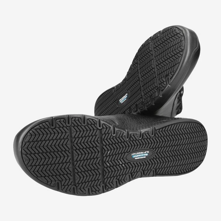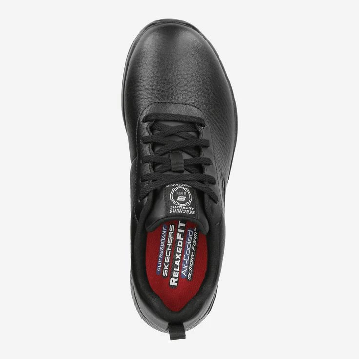 The slip-resistant rubber sole of this sturdy work shoe from Skechers will always get you through your day safely, The black leather upper is also easy to clean, adaptable and breathable. The textile insole is removable and allows you to wear custom insoles.