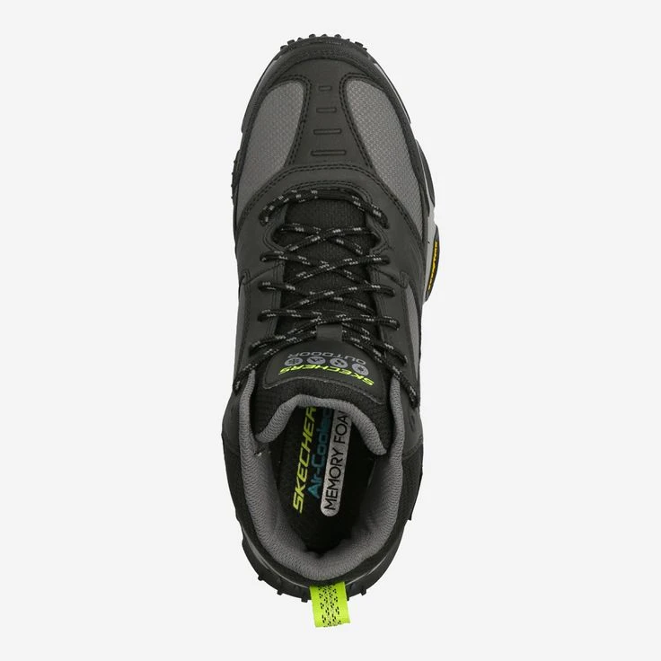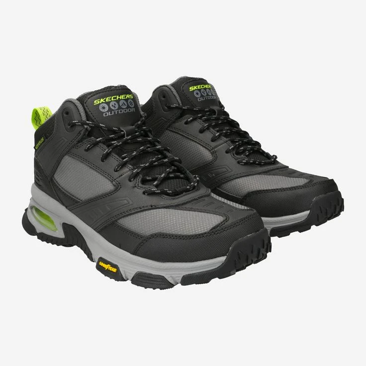 - Skechers® logo detail embossing, logo application, entry loop, decorative stitching, padded upper, water repellent, Air-Cooled Memory Foam® comfort insole, Goodyear® performance outsole